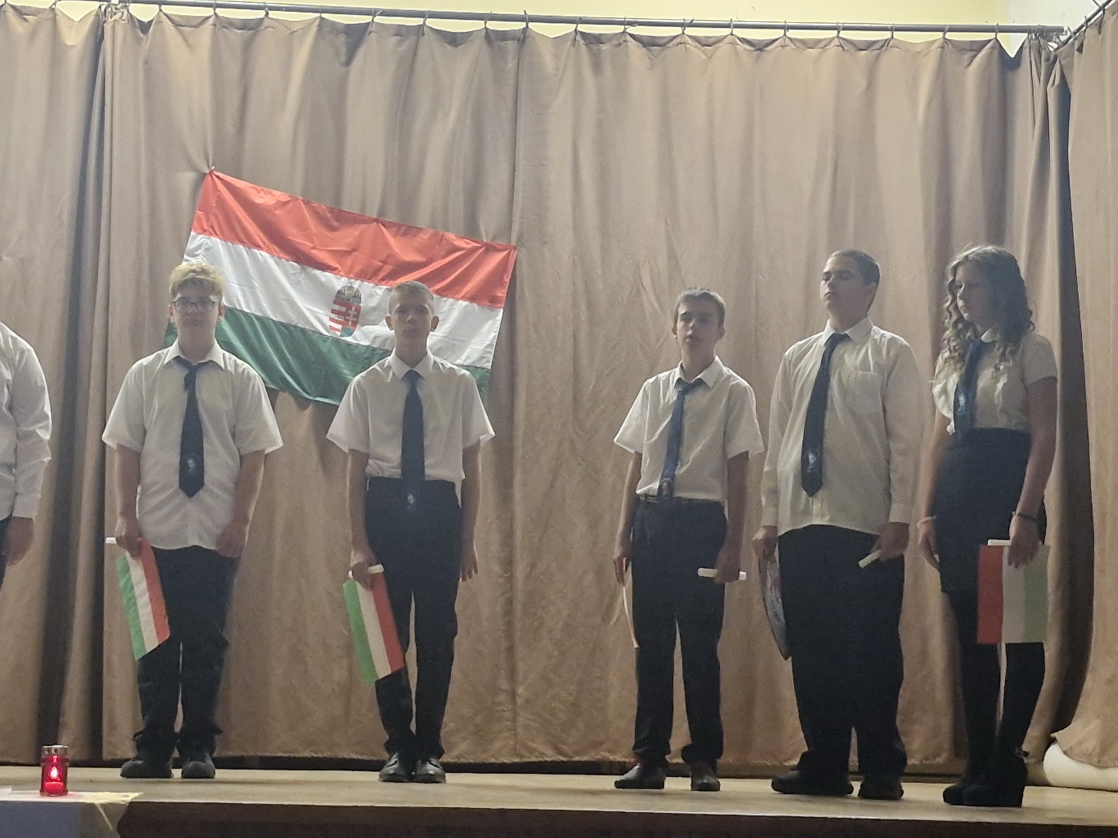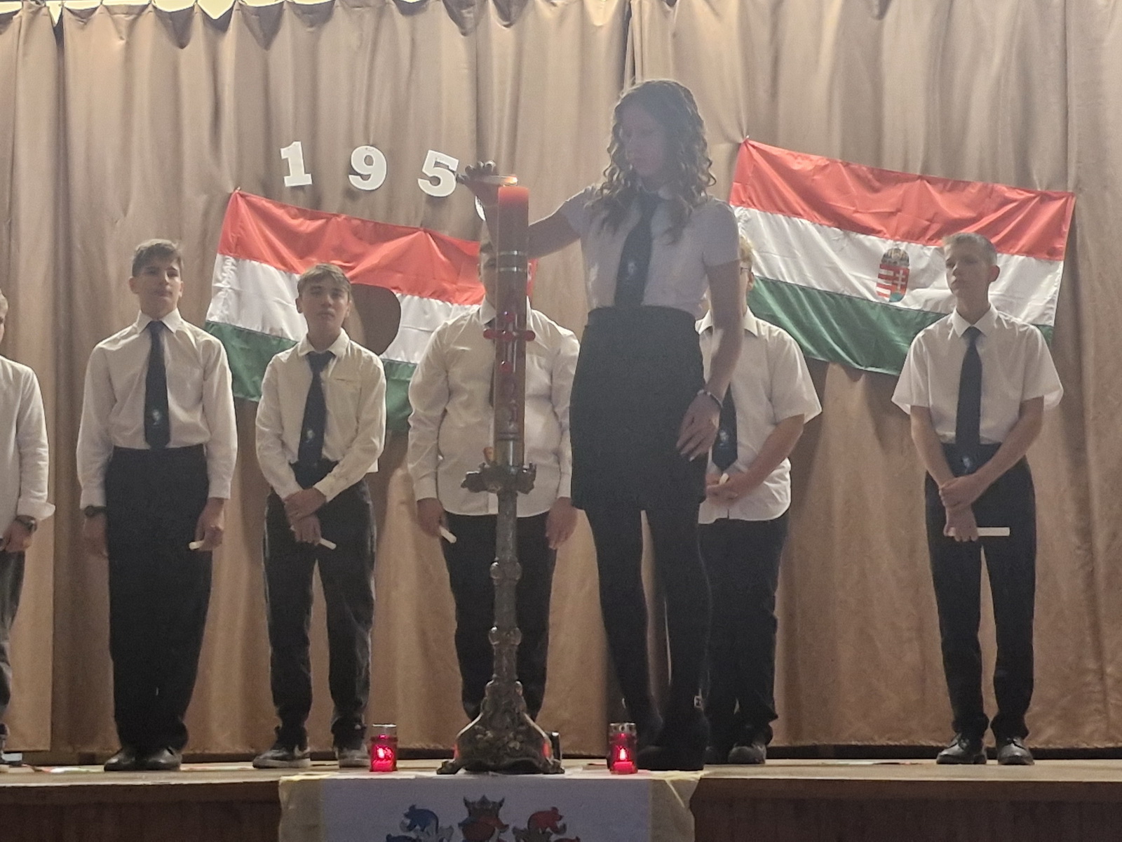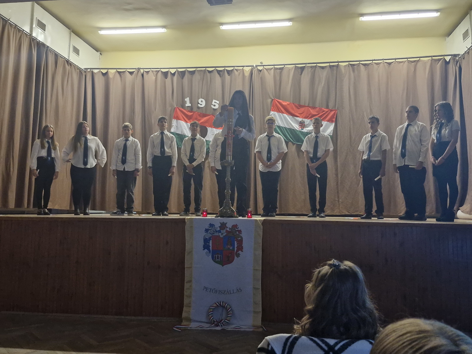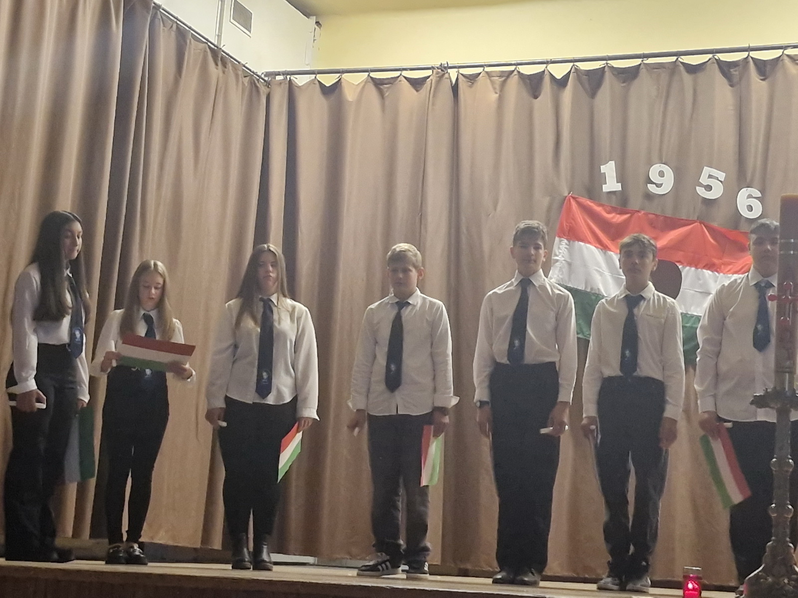 A műsort a 8. osztályos tanulók adták elő. A diákok versekkel, zenékkel, korabeli felvételekkel idézték fel a forradalom és szabadságharc pillanatait. Meghatott csendben gyújtottunk gyertyát a hős elődeink tiszteletére, akik életüket áldozták szabadságunkért, hazánk békéjéért.