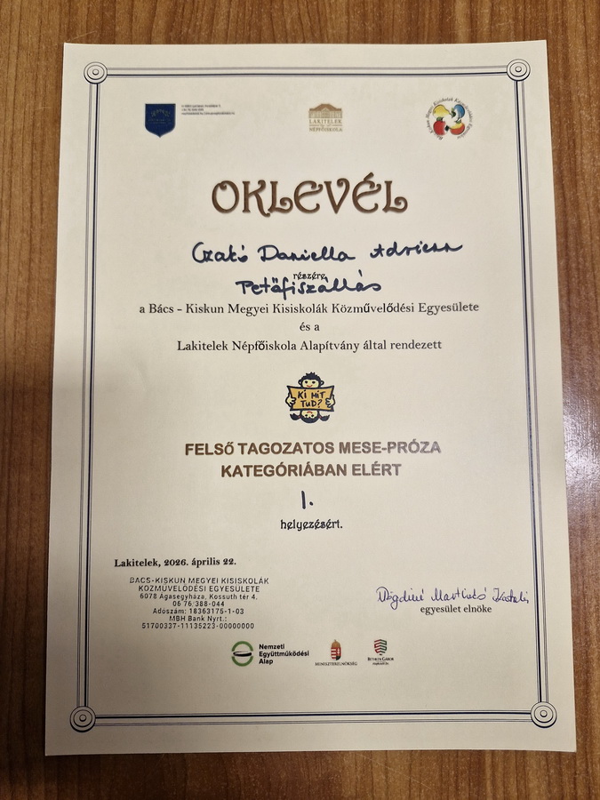 2026. április 21-22-én különleges eseménynek adott otthont a lakiteleki Hungarikum Liget: a Bács-Kiskun Megyei Kisiskolák Közművelődési Egyesülete megrendezte hagyományos KI MIT TUD? versenyét. A megmérettetésen 16 határon innen és túl lévő település iskolái vettek részt (Petőfiszállás, Fülöpjakab, Csávoly, Pirtó, Zimándújfalu, Arad, Tabdi, Kaskantyú, Ágasegyháza, Bácskertes, Pécska, Szakmár, Homokmégy, Bácsgyulafalva, Géderlak, Bezdán). Vers, mese és próza, ének, hangszeres zene, valamint rajz kategóriákban mérték össze tudásukat a gyerekek. Iskolánkat hét tehetséges tanuló képviselte: Fődi Leila, Sáfrán Anna, Szécsi Jázmin, Szatmári Lilla, Czakó Daniella, Horváth Kevin és Simon Regina. Mindannyian magabiztosan, felkészülten álltak a színpadra, és méltón képviselték intézményünket. Külön öröm, hogy Czakó Daniellamesemondásával 1. helyezéstért el.